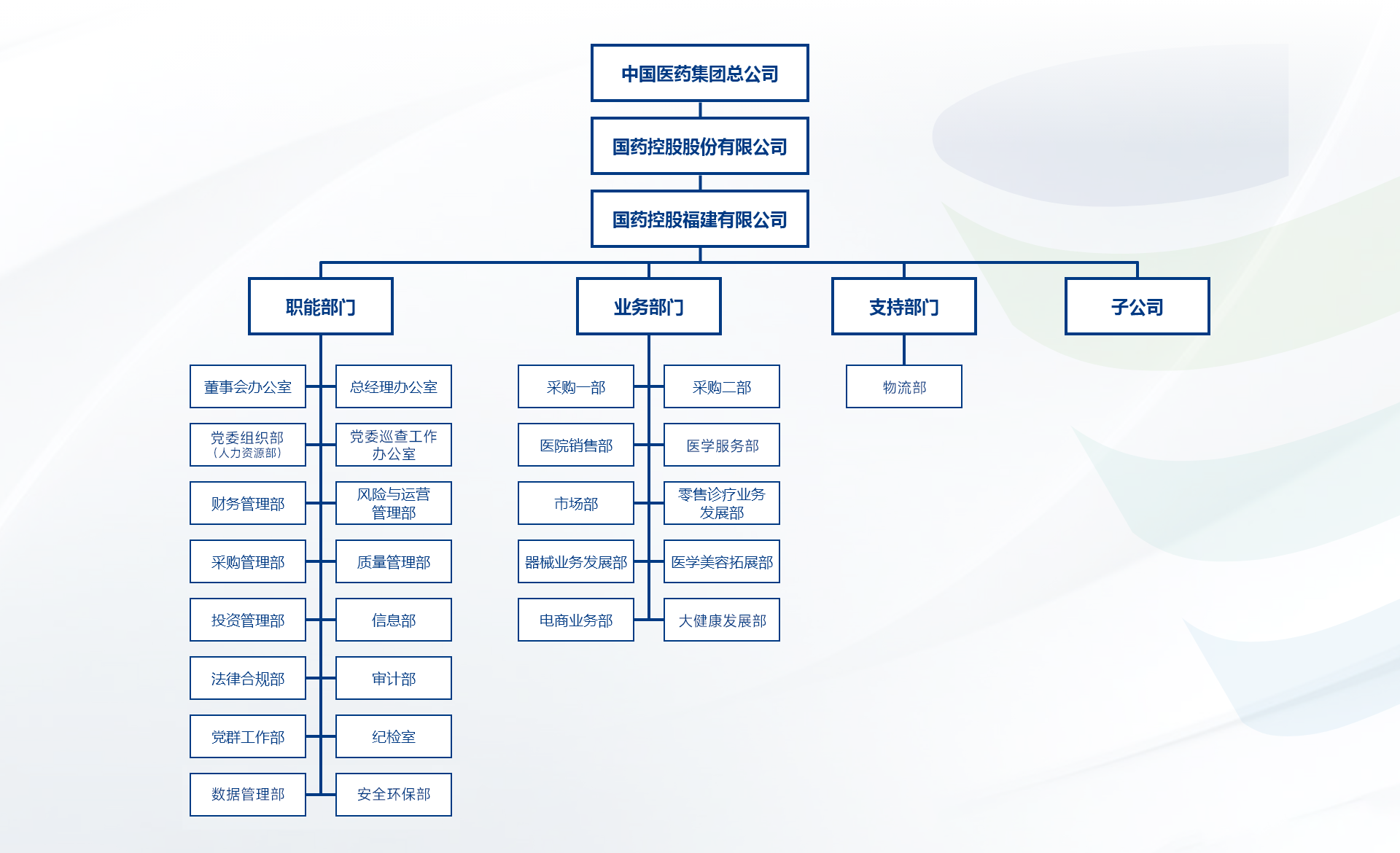 国控福建自成立以来,在国药集团、国药控股和公司董事会及党委的正确领导下,始终贯彻执行国药集团和国药控股的发展战略,深耕医药商贸流通服务行业,主营业务以“药品分销”“器械销售”“零售诊疗”“第三方物流服务”为核心,积极培育和拓展“营销服务”、“中药产品”、“生命健康业态”等板块,旗下有全资和控股子企业15家,设立了“国药控股SPS+专业药房”57家(其中具备双通道资质门店39家、门诊统筹资质门店21家),业务范围覆盖全省9个地市。